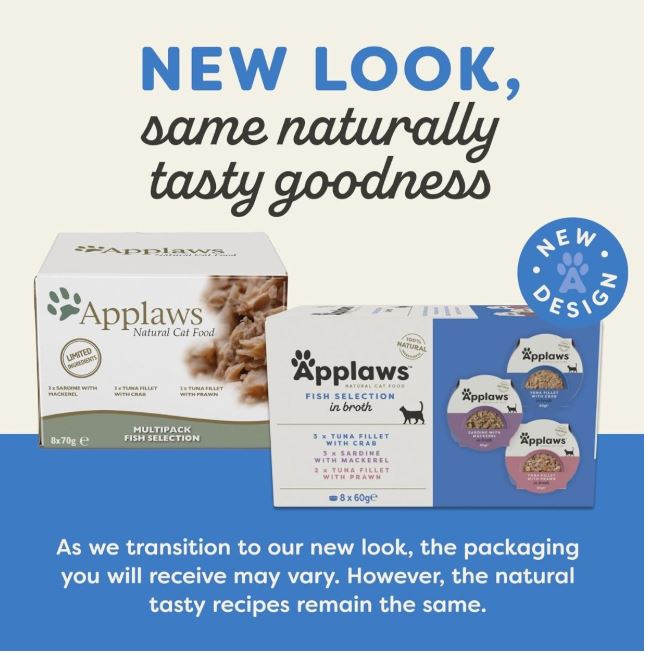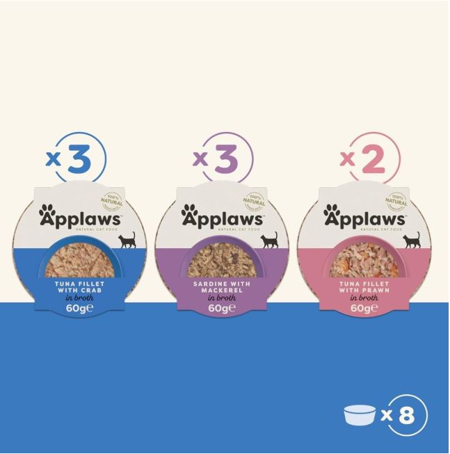 Applaws Cat Multipack Fish pot selection is a variety pack containing 3 Applaws 100% Natural Fish recipes: 3 x Sardine with Mackerel, 3 x Tuna with Crab, 2 x Tuna Fillet with Prawn. The high protein and meat based taurine, an essential amino acid for your cat, are beneficial for vision, heart function, immune system, digestion and more. For a balanced diet for your cat, these complementary pet food pots should be serve alongside a complete wet or dry cat food such as Applaws complete dry cat food.
