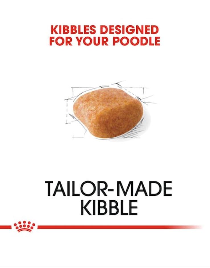 To support optimal health, ROYAL CANIN®’s Breed Health Nutrition range caters to the specific dietary needs of each breed. ROYAL CANIN® Poodle Adult is specially formulated with all the nutritional needs of your dog in mind. ROYAL CANIN® Poodle Adult contains omega-3 fatty acids such as EPA and DHA and borage oil. These nutrients – along with the specially adapted protein content – help to support the process of healthy hair growth. Thanks to the inclusion of calcium chelators, the kibble in ROYAL CANIN® Poodle Adult is exclusively designed to support your dog’s dental health by slowing down tartar formation and build-up. What’s more, this formula also helps to maintain your Poodle’s muscle tone. To cater to each dog’s individual preferences, ROYAL CANIN® Poodle Adult is also available as wet food in a soft and tasty loaf. If you’re considering mixed feeding, simply follow our feeding guidelines to ensure your dog gets an accurate amount of both wet and dry food for optimal benefit.