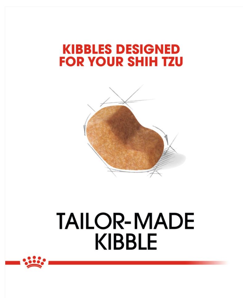 Suitable for dogs over 10 months old, ROYAL CANIN® Shih Tzu Adult is specially formulated with all the nutritional needs of your adult Shih Tzu in mind. ROYAL CANIN® Shih Tzu Adult contains an exclusive combination of nutrients that help to maintain your dog’s skin health – which in turn positively affects the health of its coat. This formula includes the omega-3 fatty acids EPA and DHA, as well as an enrichment of borage oil; these fatty acids play a large role in helping to nourish your dog’s skin and coat. ROYAL CANIN® Shih Tzu Adult’s adapted nutritional solution also contains calcium chelators, which contribute towards the maintenance of your dog’s dental hygiene. ROYAL CANIN® Shih Tzu Adult helps to maintain the health of your dog’s digestive function by contributing to a reduced faecal volume – and what’s more, it also helps to reduce the smell! The kibble in ROYAL CANIN® Shih Tzu Adult is tailor-made exclusively for this breed. Its shape and size are specially designed to make it easier for your dog to pick up and chew.