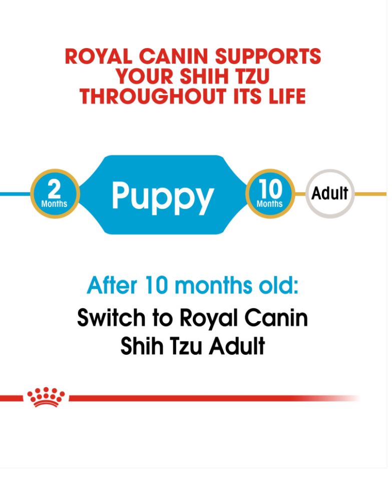 Growth is an essential stage in your dog’s life: it is the time of big changes, discoveries, and new encounters. During this key period, your Shih Tzu puppy’s natural defences develop gradually. That’s why it needs a diet containing nutrients that will support healthy growth and development. Suitable for Shih Tzus up to 10 months old, ROYAL CANIN® Shih Tzu Puppy is specially formulated with all the nutritional needs of your puppy in mind. ROYAL CANIN® Shih Tzu Puppy helps support your puppy’s immune system, thanks particularly to a patented complex of antioxidants, including vitamin E. ROYAL CANIN® Shih Tzu Puppy also contains vitamin A, EPA & DPA, and an enrichment of borage oil to help support the skin’s “barrier” role to help maintain skin health and nourish the coat. What’s more, ROYAL CANIN® Shih Tzu Puppy contains a combination of nutrients with high quality protein and prebiotics to support digestive health and help maintain a healthy balance of intestinal flora, which also contributes to good stool quality. The exclusive kibble in ROYAL CANIN® Shih Tzu Puppy is specially designed for this breed’s brachycephalic jaws, allowing your Shih Tzu puppy to easily pick its kibble up while simultaneously encouraging your puppy to chew.