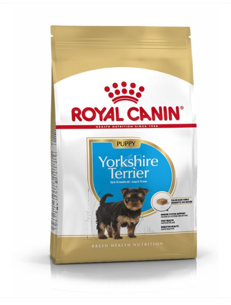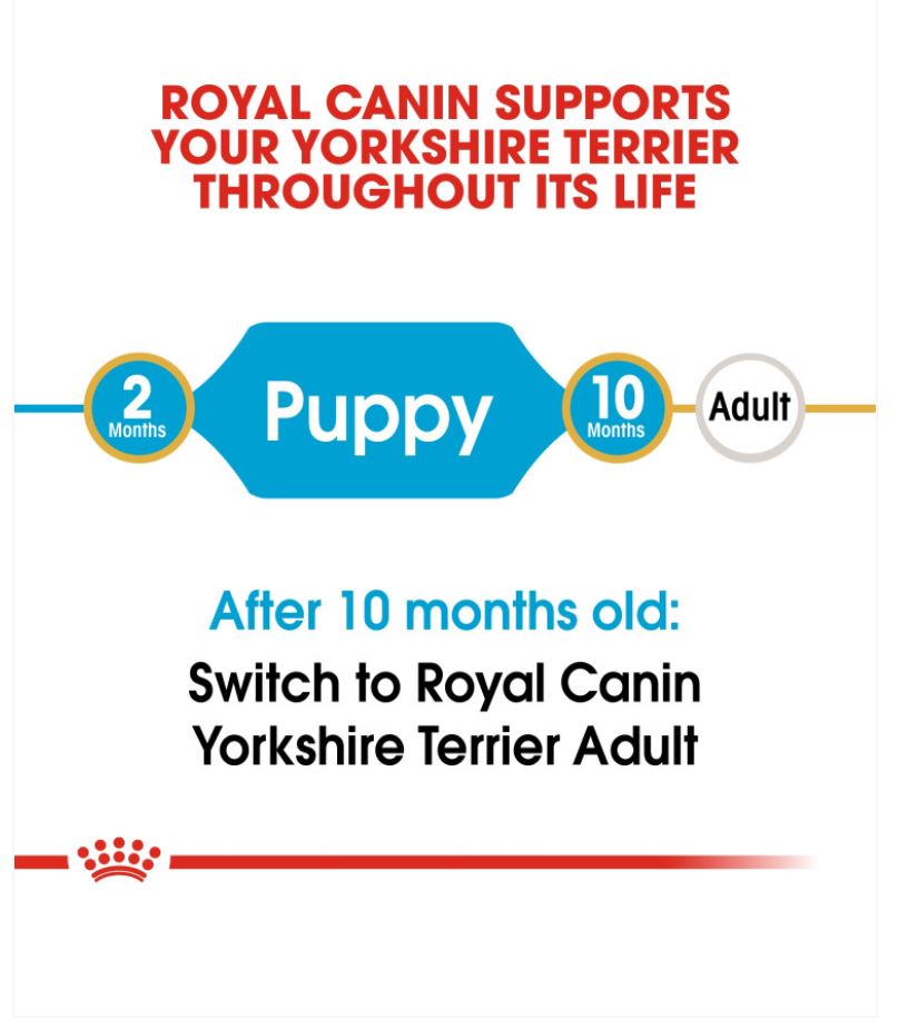Suitable for puppies up to 10 months old, ROYAL CANIN® Yorkshire Terrier Puppy is specially formulated with all the nutritional needs of your young Yorkshire Terrier in mind. Because your young Yorkshire Terrier’s immune system develops gradually, ROYAL CANIN® Yorkshire Terrier Puppy contains a patented complex of antioxidants – including vitamin E – to help support your puppy’s natural defences during this important growth phase. ROYAL CANIN® Yorkshire Terrier Puppy’s formula is enriched with an adapted content of Omega-3 fatty acids (EPA and DHA) and Omega-6 fatty acids (from borage oil), as well biotin to help maintain your puppy’s coat health. ROYAL CANIN® Yorkshire Terrier Puppy also helps to support digestive health. Nutrients with highly digestible, high quality protein (L.I.P.) and prebiotics (FOS) are included to help your puppy maintain a healthy balance of intestinal flora. What’s more, the exclusive kibble in ROYAL CANIN® Yorkshire Terrier Puppy supports dental hygiene by helping to slow down tartar formation.