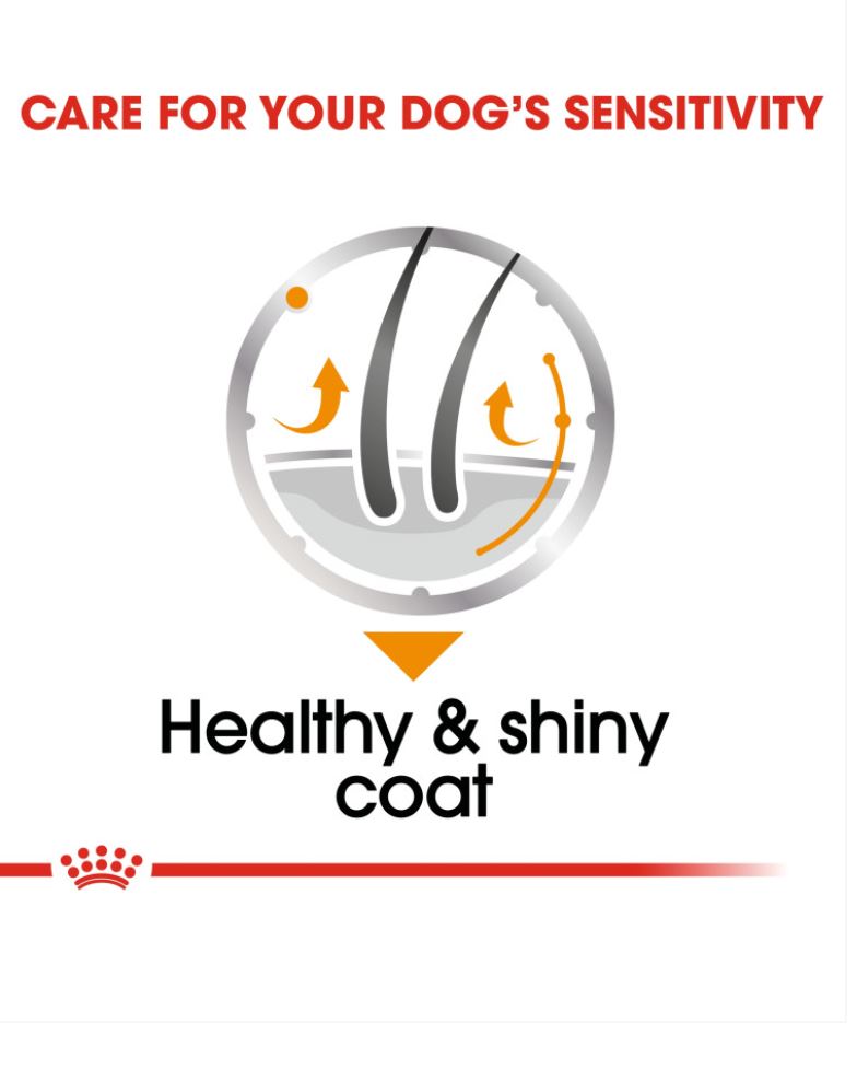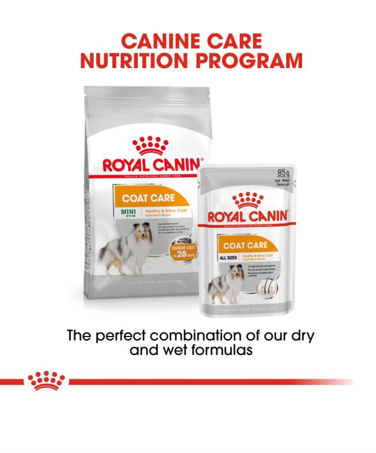 A good reflection of your dog’s well-being is his coat condition. A rich and silky coat is a sign of effective nourishment. ROYAL CANIN® Coat Care Loaf’s smart formula feeds your dog’s skin and coat from the inside, meaning your dog will not only look better but feel great too. This food is enriched with fatty acids Omega 3 and 6, as well as GLA-rich Borage Oil. These nutrients help to nourish your dog’s skin and coat. What’s more, melanin precursors tyrosine and phenylalanine are also included in ROYAL CANIN® Coat Care Loaf’s exclusive formula; these nutrients work to intensify your dog’s coat colour. ROYAL CANIN® Coat Care Loaf is suitable for dogs of all sizes with dull and rough hair. Decades of advanced scientific research into canine nutrition are at your service in this food that feeds your dog’s coat too! In addition to this delicious pâté, our Coat Care nutritional program is also available as crunchy kibble. Both are nutritionally complete and perfectly complement each other. Why not try the pâté as a delicious topping to the kibble?