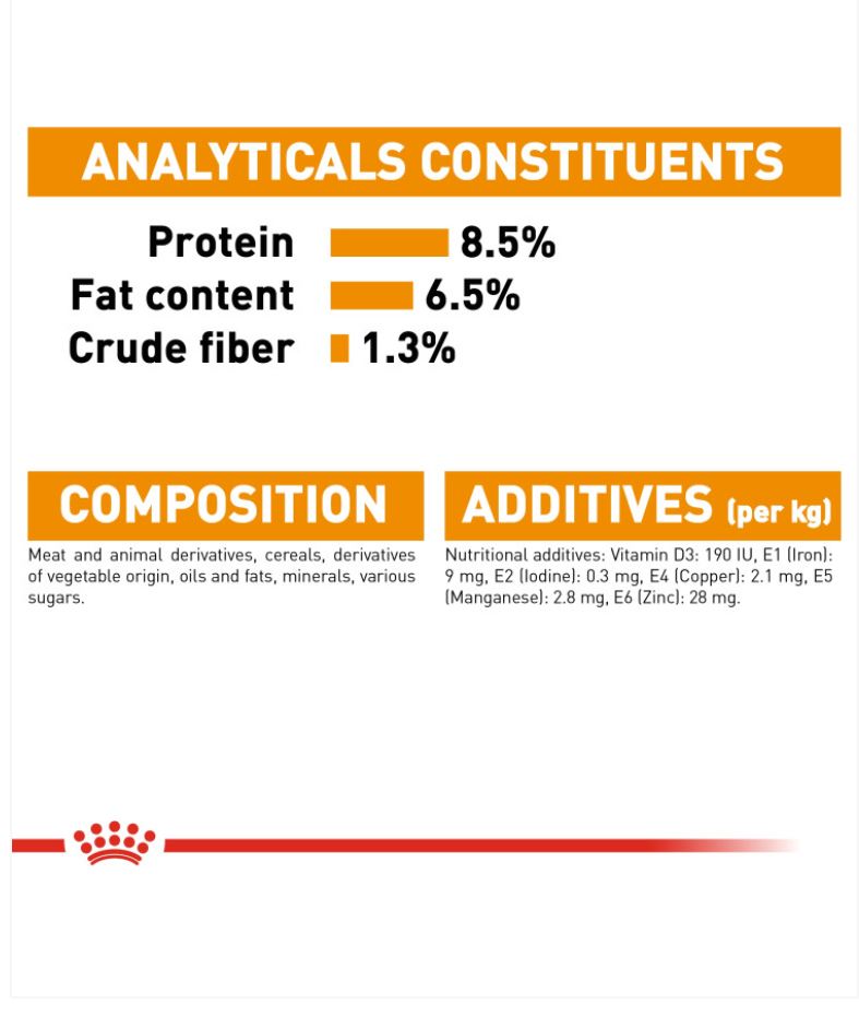 Analytical constituents: Protein: 8.5% – Fat content: 6.5% – Crude ash: 1.8% – Crude fibres: 1.3% – Moisture: 78.0%.