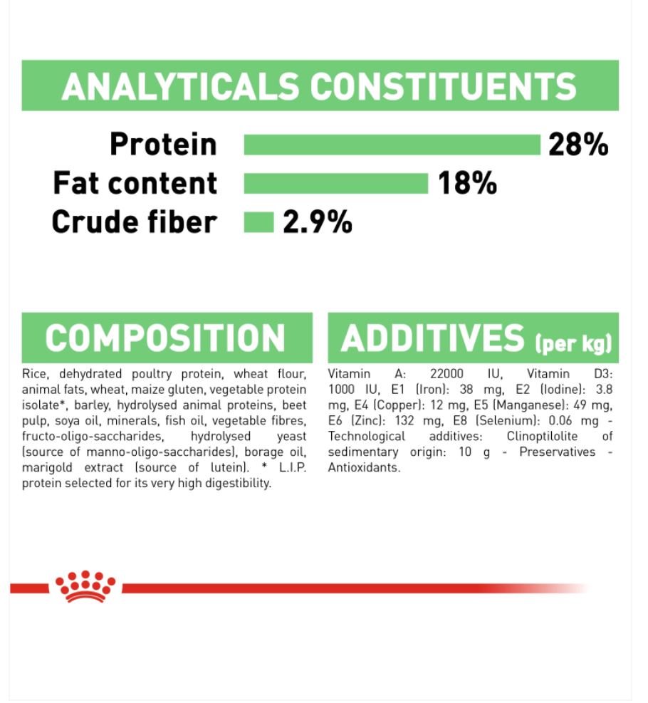 Composition: dehydrated poultry protein, rice, wheat flour, animal fats, vegetable protein isolate*, wheat, hydrolysed animal proteins, barley, maize gluten, vegetable fibres, beet pulp, fish oil, soya oil, minerals, psyllium husks and seeds, borage oil, marigold extract (source of lutein), hydrolysed crustaceans (source of glucosamine), hydrolysed cartilage (source of chondroitin).