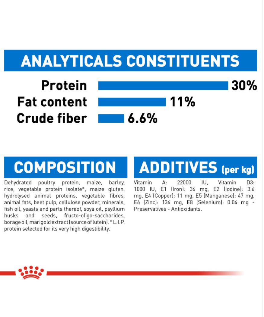 A high protein content* (30%) helps maintain muscle mass and a low fat content* (11%) helps limit weight gain. An optimal combination of soluble and insoluble fibers helps him feel full, while omega-3 fatty acids help support healthy joint movement. Complete, delicious and hungersatisfying nutrition that keeps him lean and his joints healthy