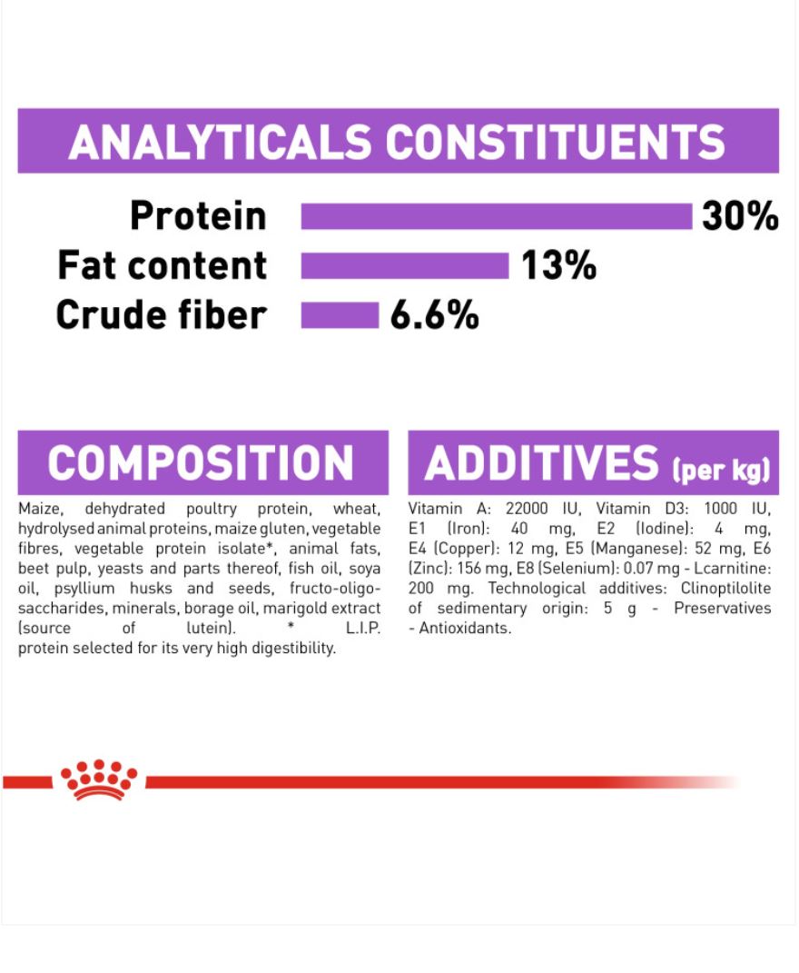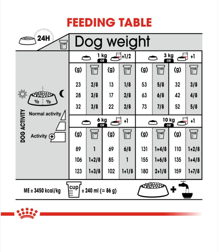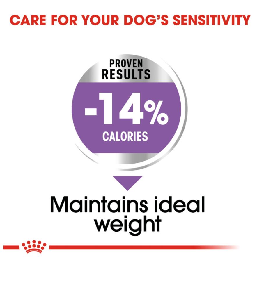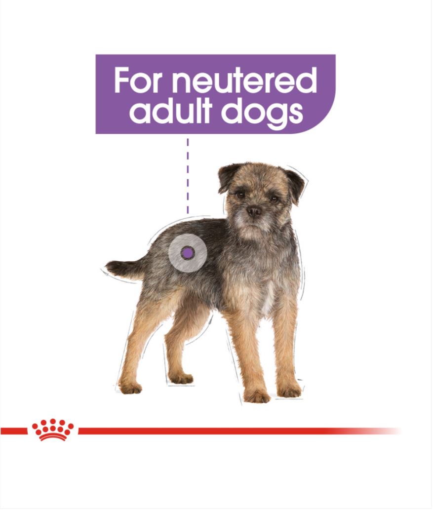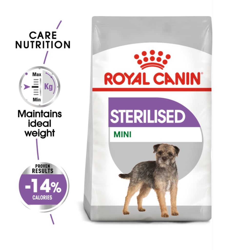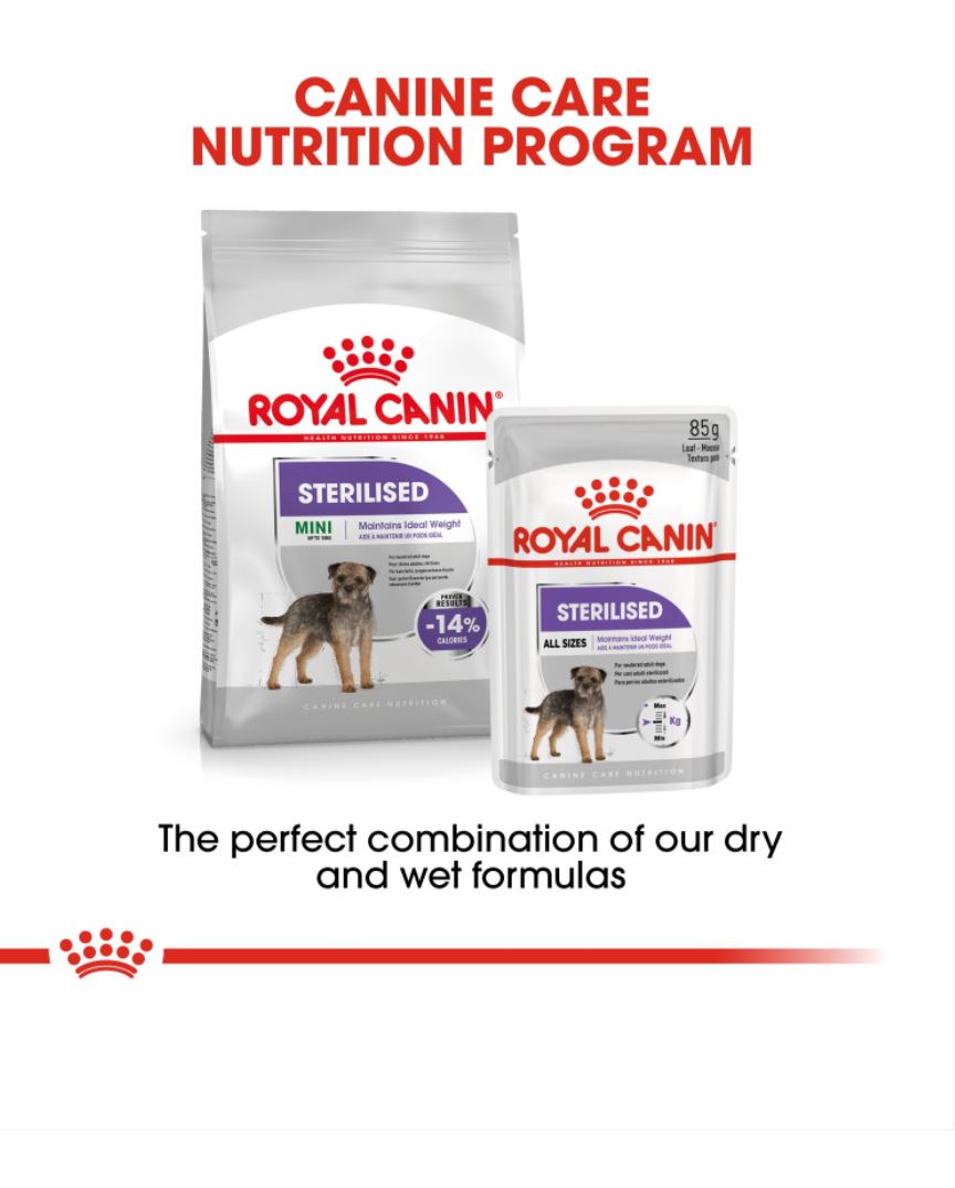 ROYAL CANIN Mini Sterilised Care is a nutritionally balanced diet for small, neutered adult dogs that weigh up to 10kg. This exclusive nutritional profile helps to support a healthy body weight while also helping your dog to feel full and satisfied between meals. · Specially formulated for small dogs · Reduces calorie intake · Supports ideal weight management · 14% fewer calories than regular dog food This product is also available as wet food in a delicious pâté loaf. If you tend to feed your dog a mix of wet and dry food, be sure to follow the feeding guidelines for accurate amounts.
