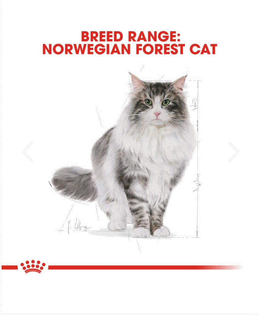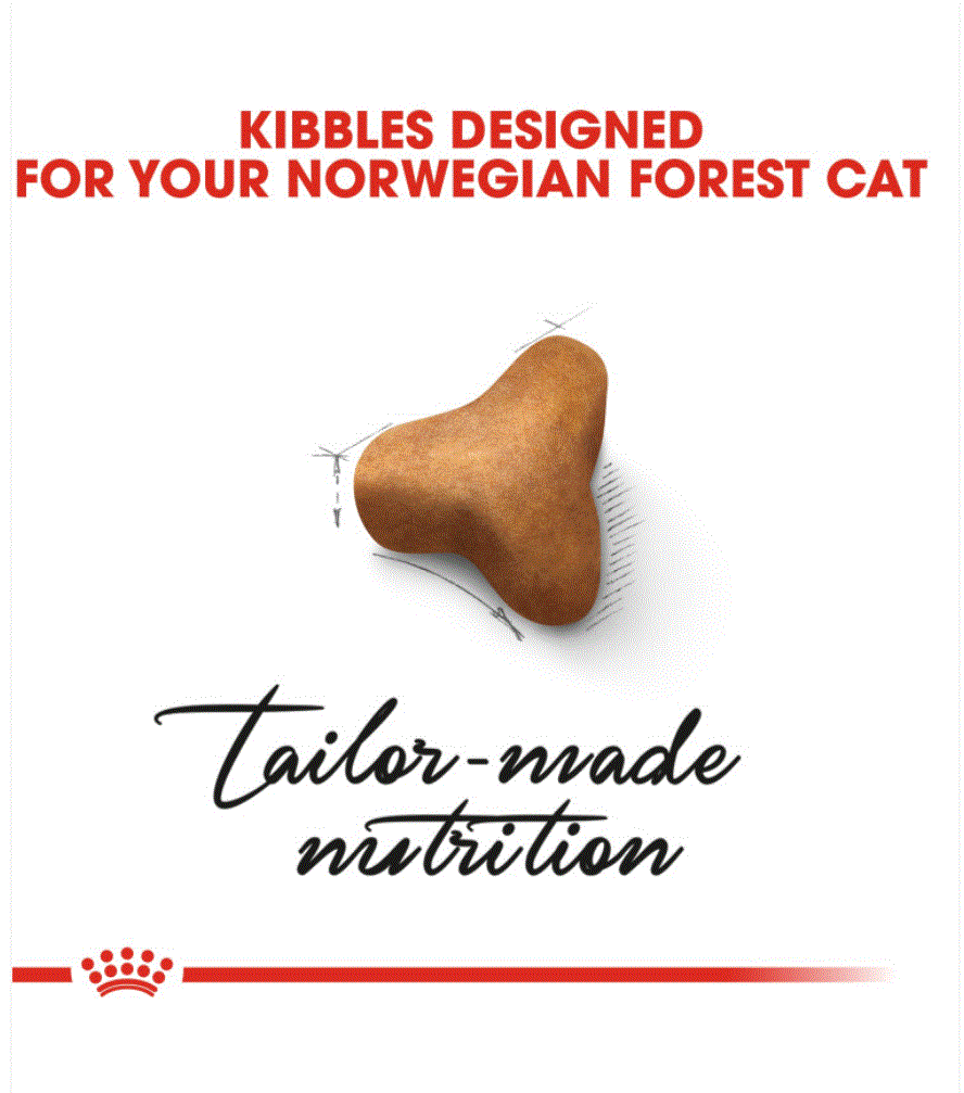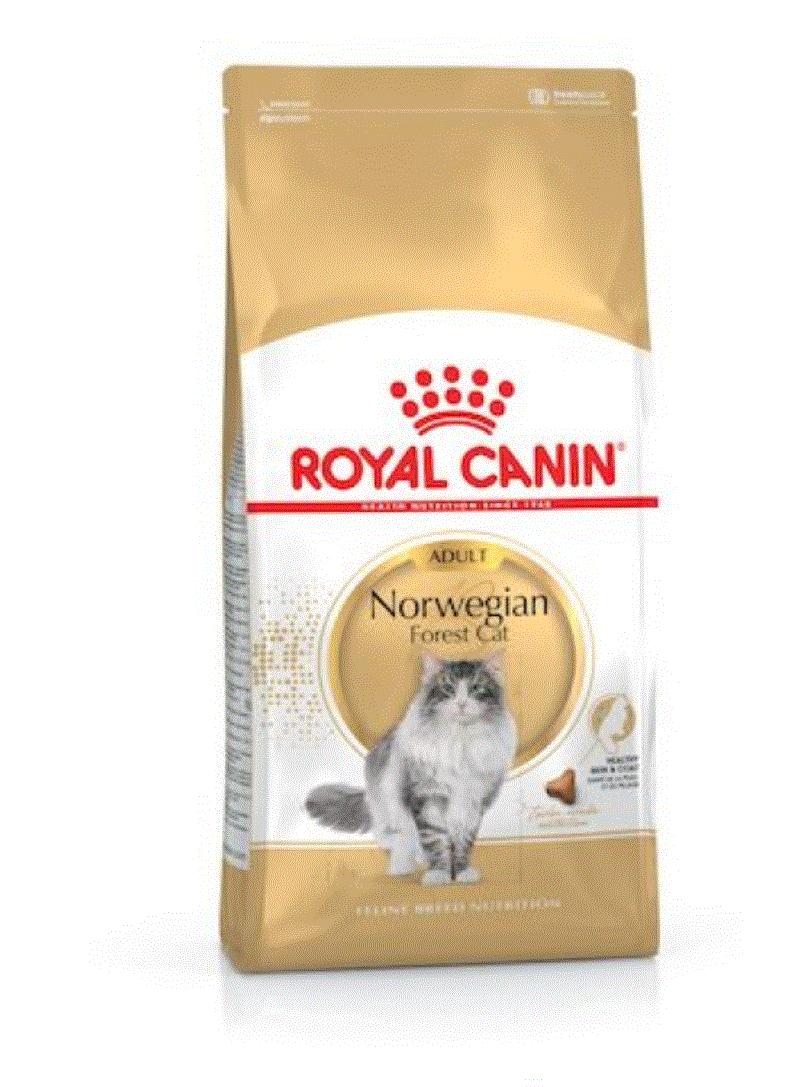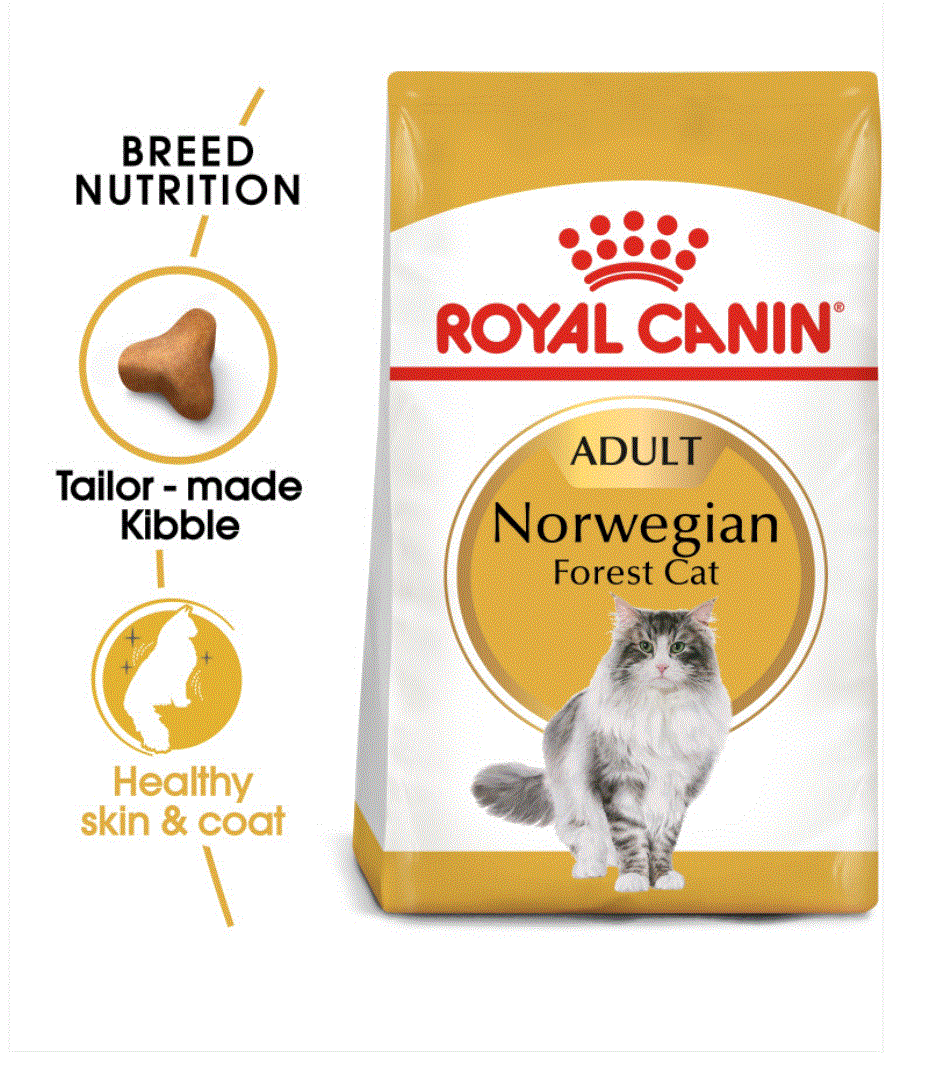 ROYAL CANIN® Norwegian Forest Cat Adult food is formulated with the specific needs of the Norwegian Forest breed in mind. Its tailor-made, three-tier kibble is adapted to the Norwegian Forest Cat’s strong jaw and encourages prolonged chewing in order to reduce the speed at which it eats. A specific blend of fibres helps to naturally stimulate your cat’s intestinal transit and helps to reduce and control the formation of hairballs. The Norwegian Forest Cat has a thick coat consisting of a water-repellent upper coat and a woolly, thick undercoat for insulation. The exclusive complex of nutrients in ROYAL CANIN® Norwegian Forest Cat Adult food helps to support the skin’s barrier role to effectively maintain an ideal skin health and good coat condition. Containing an adapted formula that helps to maintain an ideal bodyweight, ROYAL CANIN® Norwegian Forest Cat Adult food also helps support healthy bones and joints. It’s enriched with L-Carnitine, an important nutrient that’s involved in maintaining a healthy fat metabolism.
