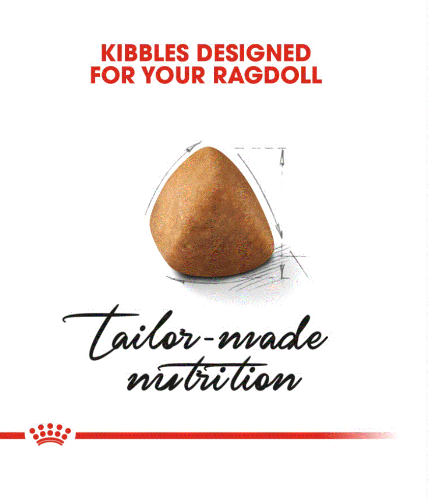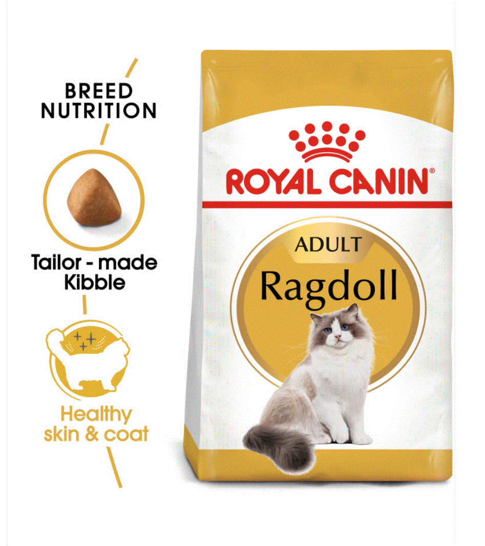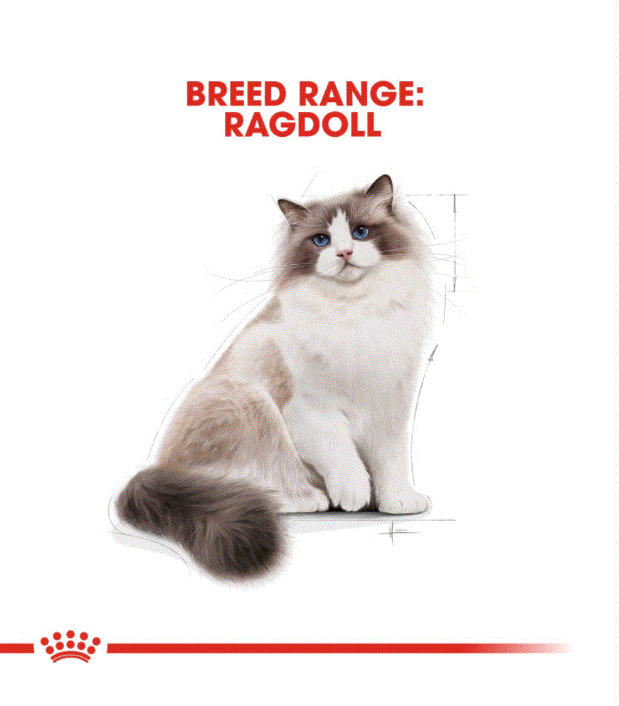 The Ragdoll is a remarkably stunning cat with captivating eyes and a soft, silky coat. The Ragdoll breed is large and loving with an affectionate and sociable nature; an absolute joy to be around. ROYAL CANIN® Ragdoll Adult food will help to maintain your cat’s healthy skin and a well-nourished coat through a combination of specific nutrients; including amino acids, vitamins, and both omega-3 and omega-6 fatty acids. ROYAL CANIN® Ragdoll Adult food contains a concentrated amount of taurine to help support healthy cardiac function for your cat. The Ragdoll’s large frame and heavy bones can be physically demanding, which is why ROYAL CANIN® Ragdoll Adult is designed with an enrichment of EPA and DHA (found in fish oil) to help support strong bones and healthy joints. The ROYAL CANIN® Ragdoll Adult kibble is meticulously crafted to adapt to the Ragdoll cat’s broad jaw, allowing it to be easily grasped to encourage chewing and support oral hygiene.