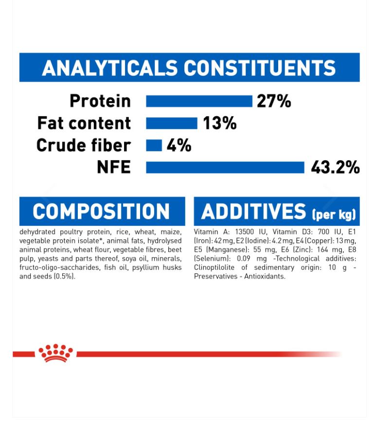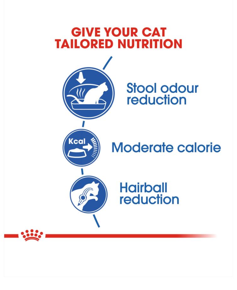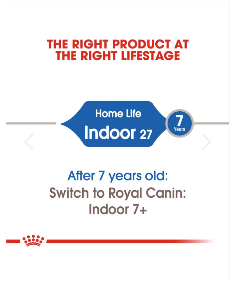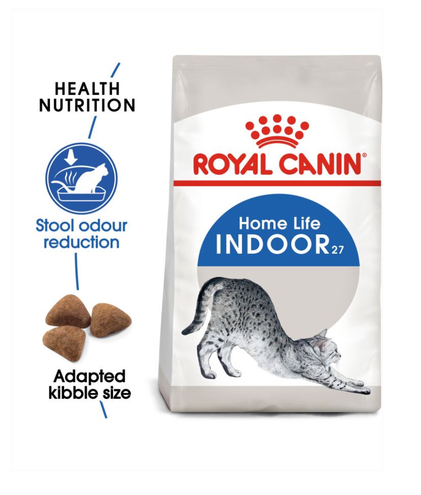 Indoor adult cats like yours tend to get less exercise than outdoor cats, that’s why a balanced and complete diet containing beneficial nutrients is important for optimal health. ROYAL CANIN® Indoor 27 contains a highly digestible protein (L.I.P.) that’s specifically selected for its very high digestibility. This protein also helps to reduce the quantity of your cat’s stool, as well as reducing the smelly stool odour that occurs when cats have a lower intestinal transit due to a lack of exercise. This food has a moderate fat content in order to ensure that your cat’s calorie intake is aligned with its level of activity – the calorie content also contributes to the maintenance of a healthy weight. It’s common for indoor cats to spend long periods of time grooming themselves. Thanks to the inclusion of specific dietary fibres, such as psyllium, this food also helps to stimulate the clearance of ingested hair – resulting in a significantly reduced amount of hairballs. Variations of ROYAL CANIN® Indoor dry food are also available depending on your cat’s lifestyle, appearance, and age: Indoor Appetite Control, Indoor Long Hair, and Indoor 7+.